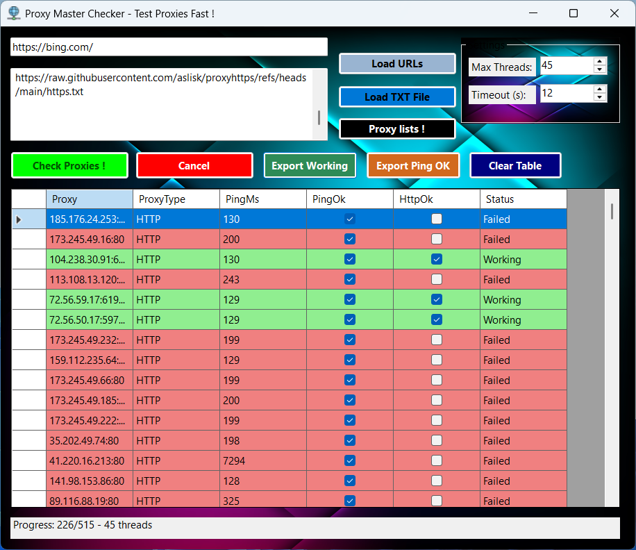 Proxy Master Checker is a powerful, multi-threaded proxy validation tool that tests proxies for connectivity and HTTP functionality.It features color-coded results, customizable performance settings, and flexible export options.